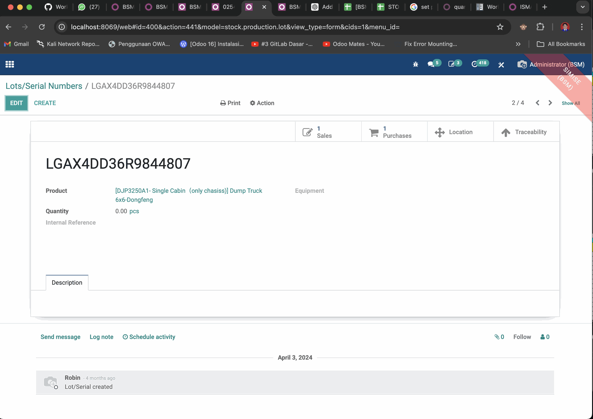 Pada contoh di bawah ini, product tersebut memiliki 4 Lot/Serial Number. Akan tetapi hanya 2 Product saja yang memiliki Quantity.