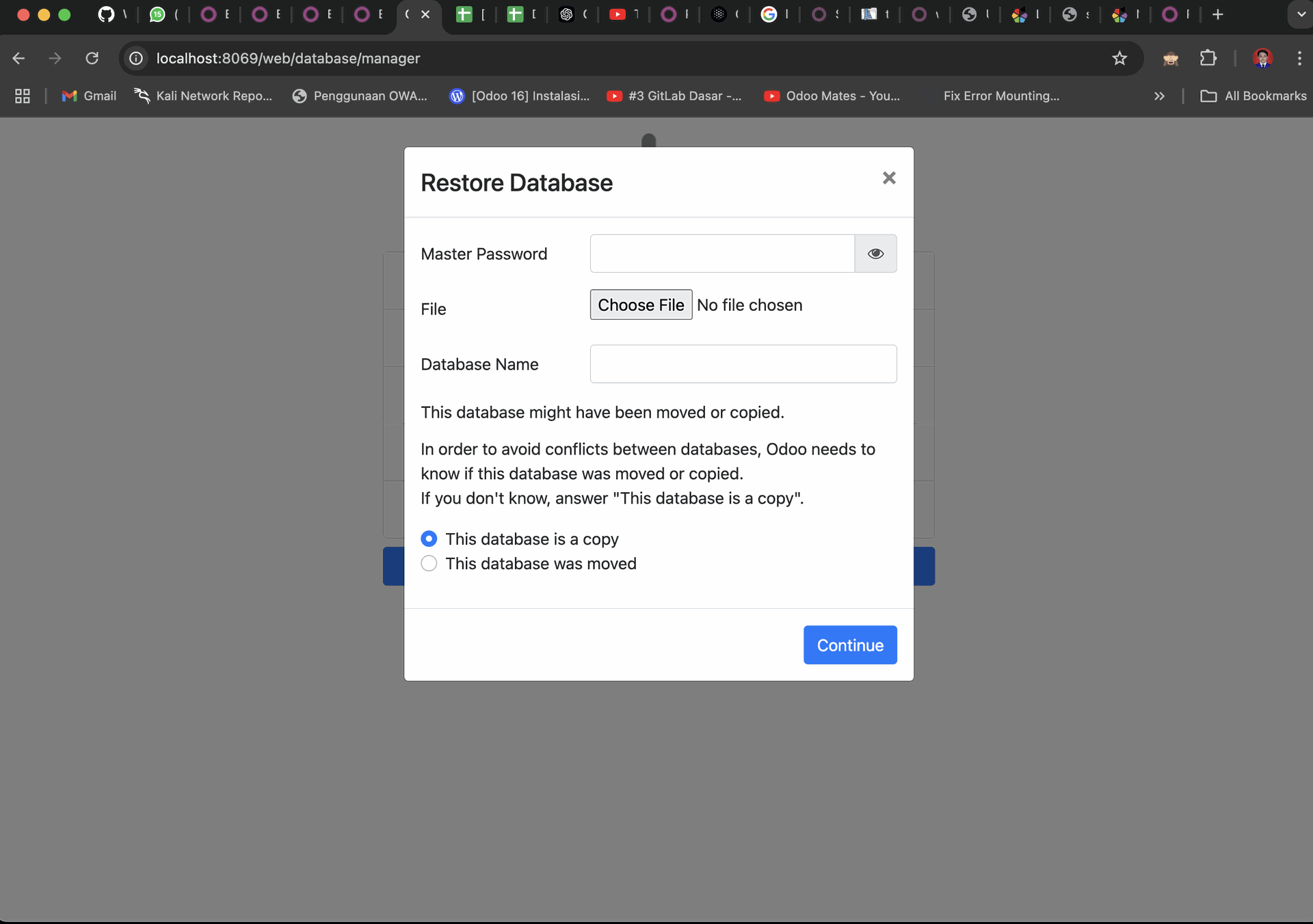 Kemudian ketik : "cp -R * ~/Library/Application\ Support/Odoo/filestore/(nama database yang telah anda buat pada saat restore pada database manager)"