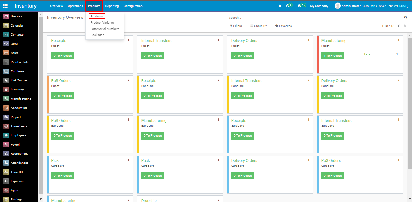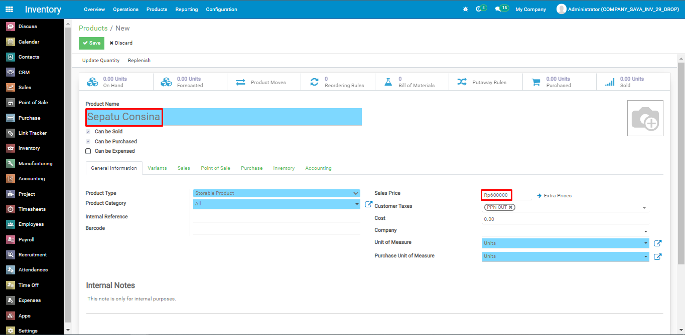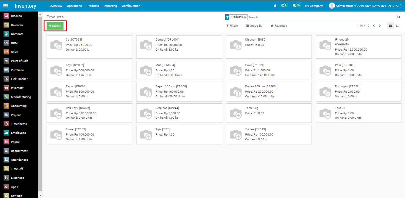 2. Setelah teman-teman berhasil menginstall module stock_dropshipping, kemudian kita buat master Product Baru terlebih dahulu dengan cara masuk ke menu Inventory > Product > Product