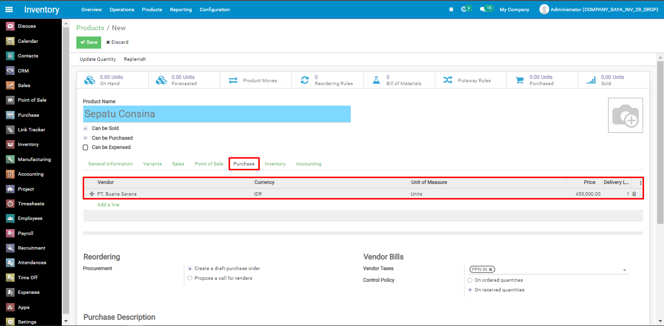 6. Setelah itu tentukan vendor dan harga nya dengan cara masuk ke tab purchase
