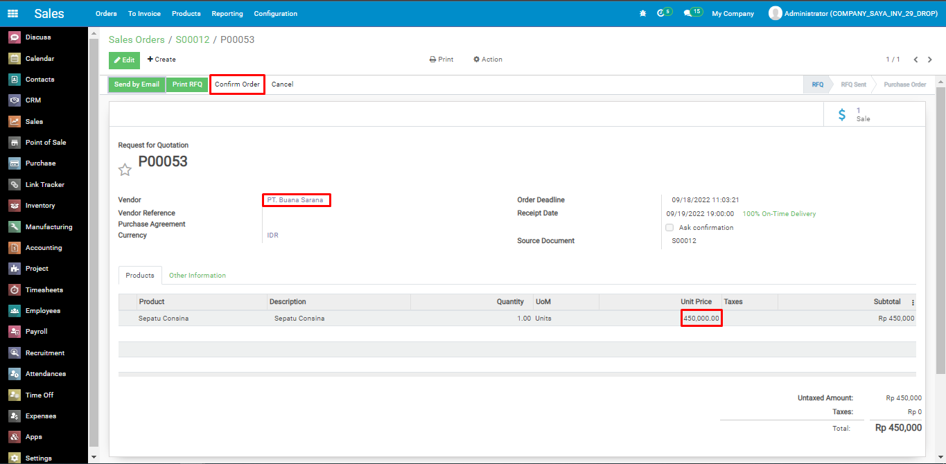 11. Ketika smart button purchase nya diklik, maka nanti secara otomatis akan muncul vendor dan unit price nya yang telah kita settings pada point 6 di atas, kemudian klik button Confirm Order