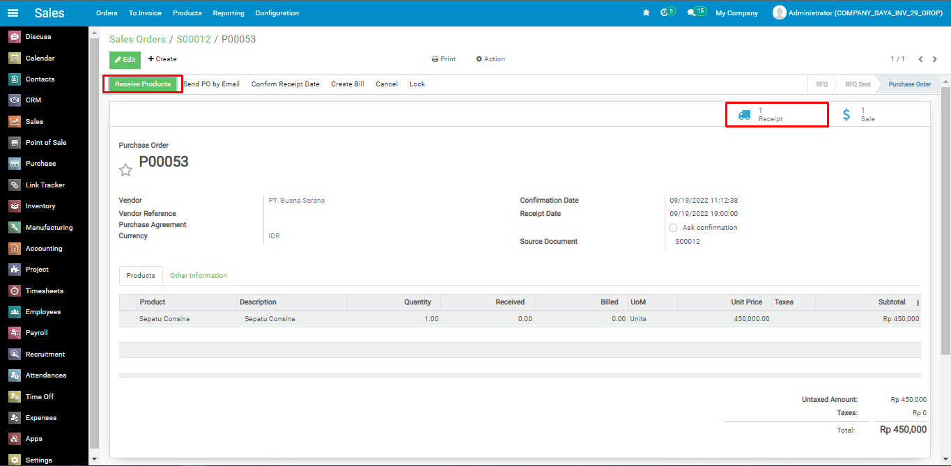 12. Setelah diklik button Confirm Order maka nanti state nya berubah menjadi Purchase Order dan otomatis muncul smart button Receipt dan button Receive Product