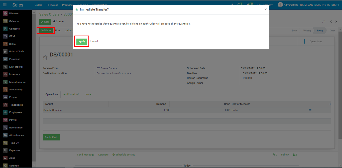 15. Jika kita klik smart button Delivery maka nanti akan muncul informasi pengirimnya yaitu PT. Buana Sarana yang telah kita settings sebelumnya di point 6 dan informasi tujuan pengirimannya yaitu ke Partner Locations/Customer
