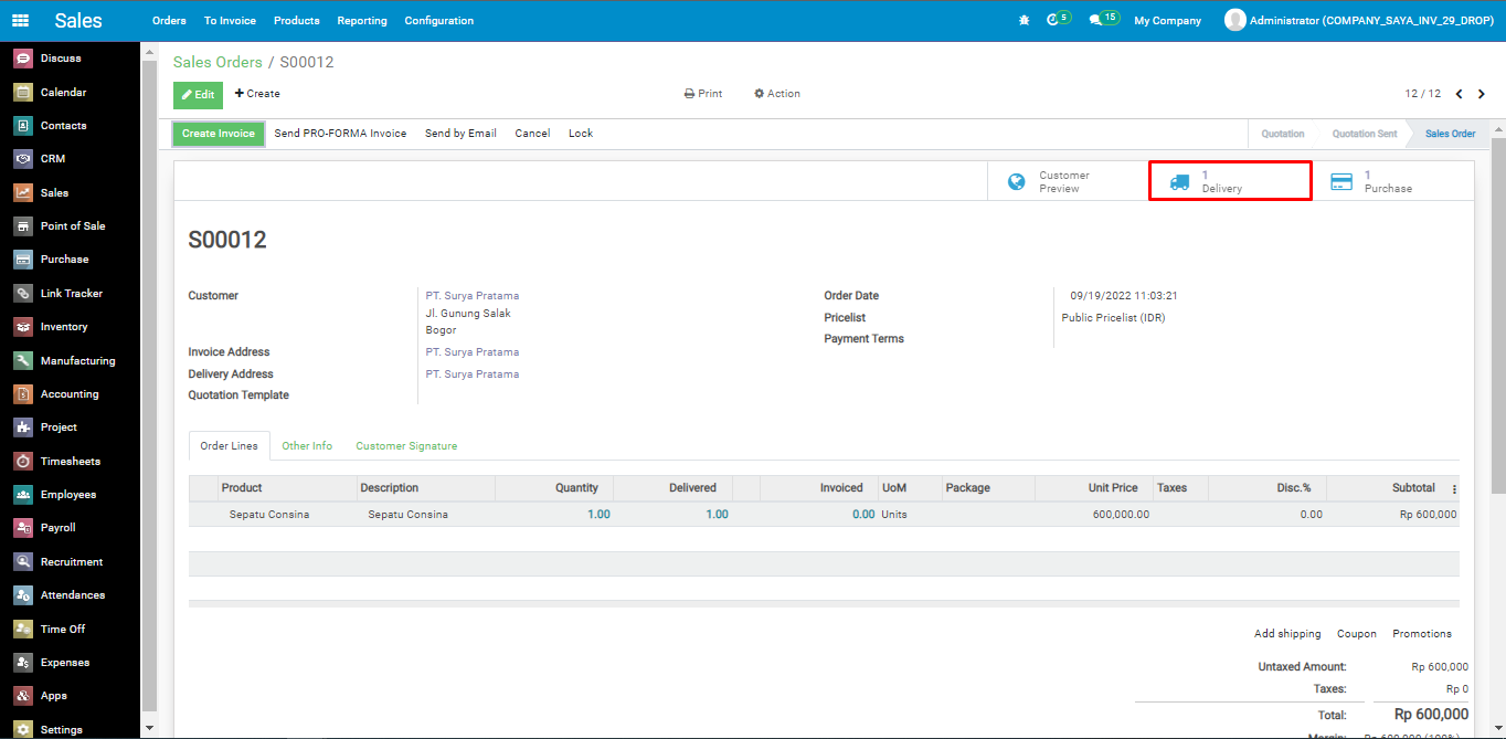 14. Kemudian jika kita lihat di form Sales Order maka secara otomatis muncul smart button Delivery