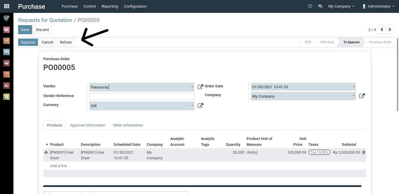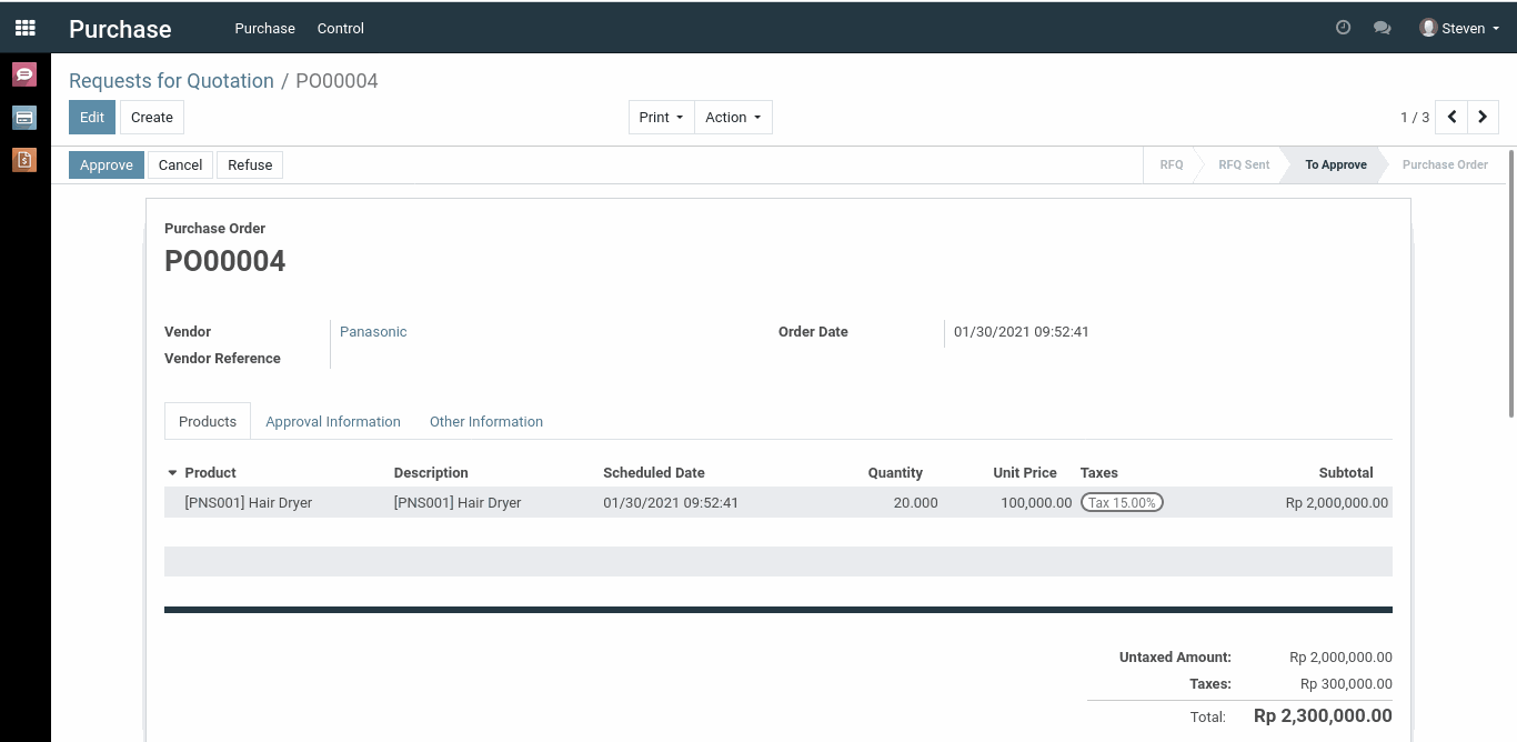 Dalam kasus ini, seorang user membuat dokumen dengan total jumlah pembelian sebesar Rp. 2.300.000. Jika kita melihat kembali gambar yang pertama, urutan pertama adalah Administrator dan Marc Angelo dengan minimal amount Rp. 20.000. Karena total jumlah pembelian melebihi dari minimal amount urutan yang pertama, maka dokumen ini harus disetujui dahulu oleh Administrator atau Marc Angelo selaku urutan yang pertama.