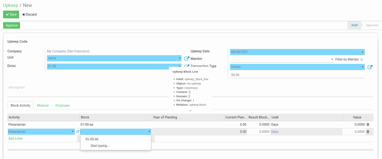 maka ketika kita menambahkan record baru pada one2many dan memilih block, block yang sudah dipilih yaitu 01-00-aa tidak akan muncul lagi