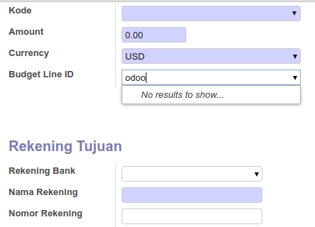 Masalah : Secara default odoo hanya menggunakan field 'name' pada saat many2one dicari di tempat lain. Dalam posting ini saya akan mencari field Budget Line ID dan menambahkan field many2one lain saat Budget Line ID dicari , contohnya seperti gambar berikut: