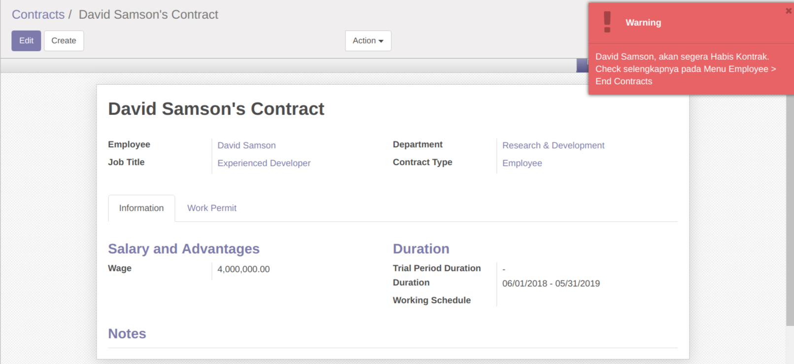 Selain sebagai pengingat, adanya notifikasi dan menu End Contracts ini juga akan memudahkan kita untuk memanage kontrak karyawan.