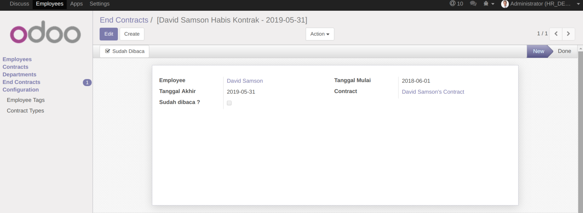 Ketiga, sesuai yg tertera pada notifikasi tsb, kita masuk menu Employee > End Contracts.