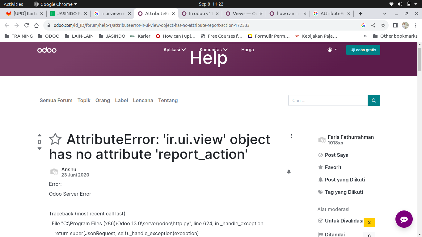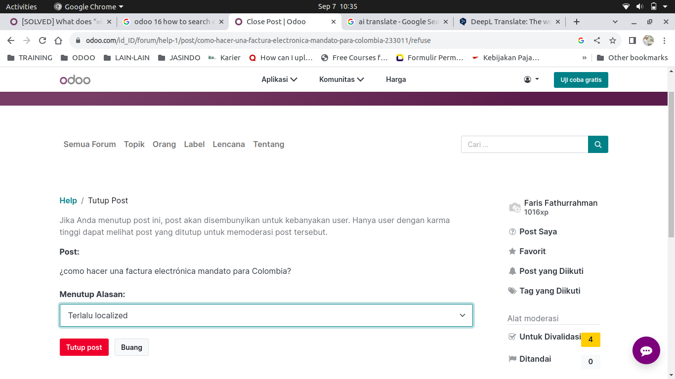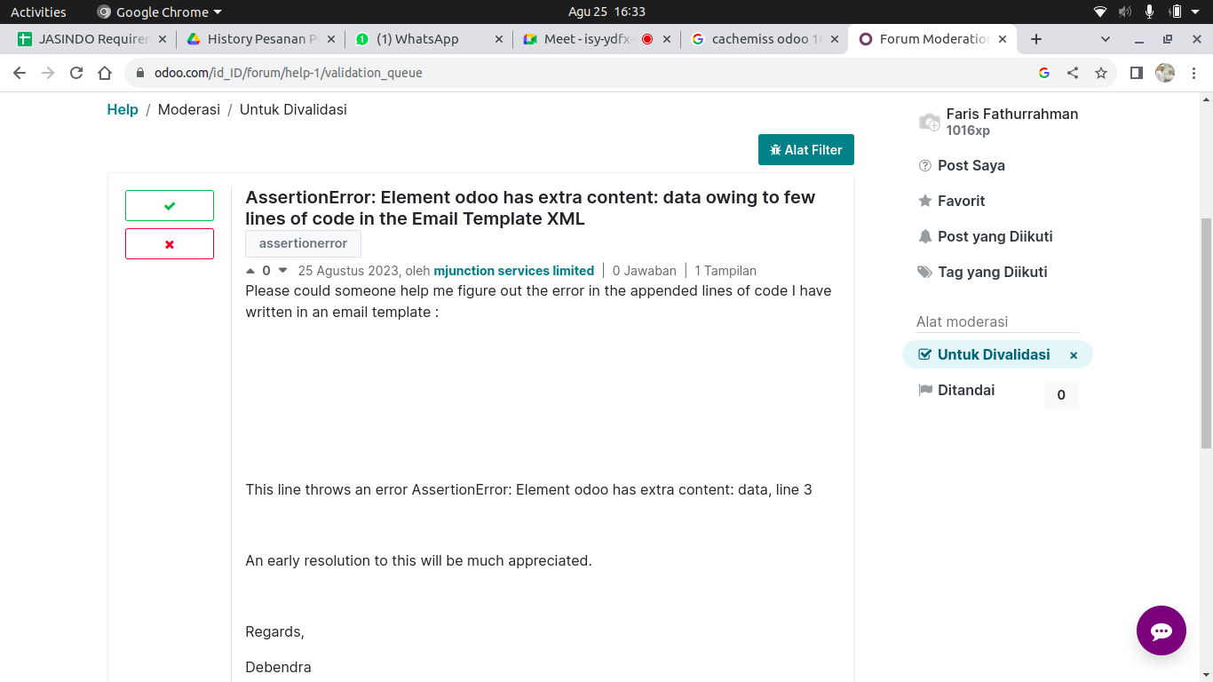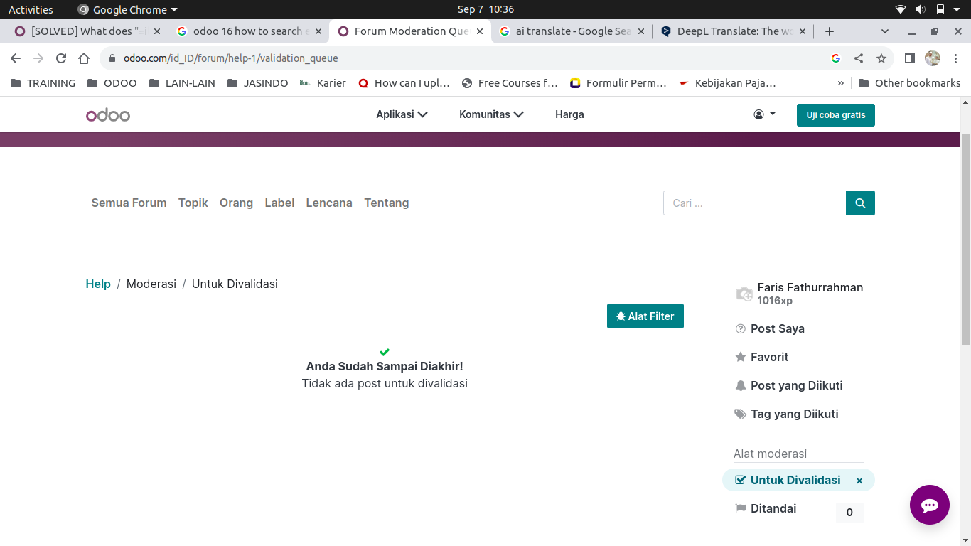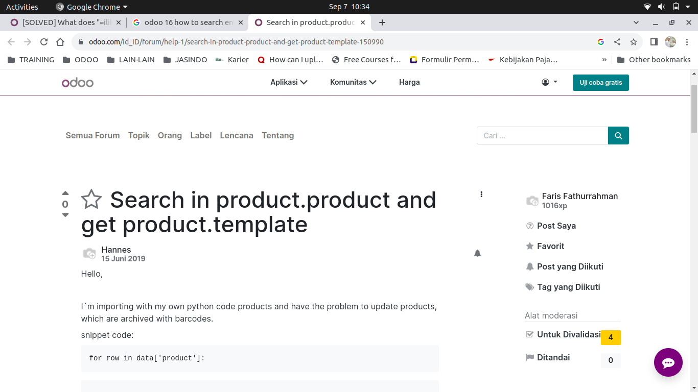 Pada artikel kali ini, izinkan saya membagikan sedikit pengalaman saya. Berikut adalah beberapa tangkapan layar yang menunjukkan beberapa tampilan yang saya dapatkan ketika saya, secara tanpa pengetahuan saya, dijadikan sebagai Moderator pada Forum resmi milik Odoo di Odoo.com: